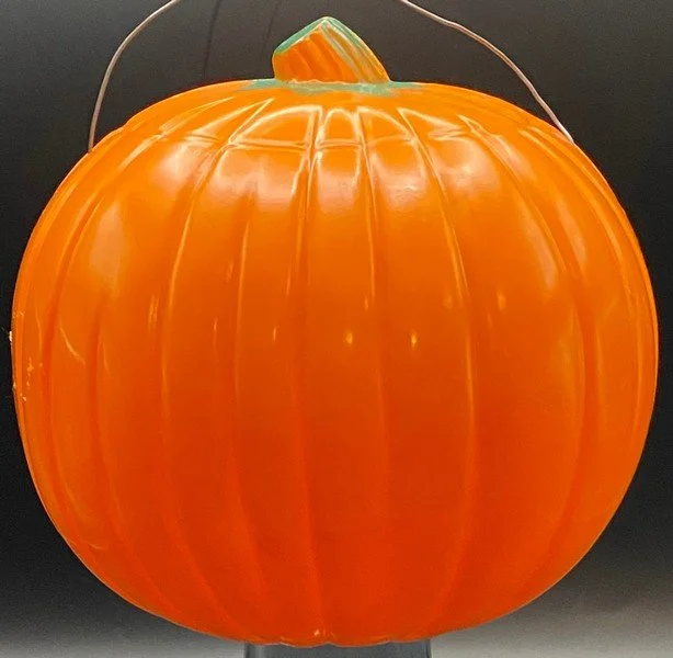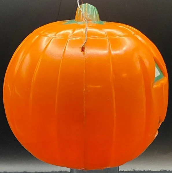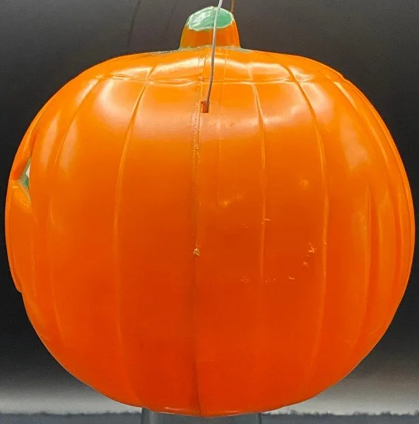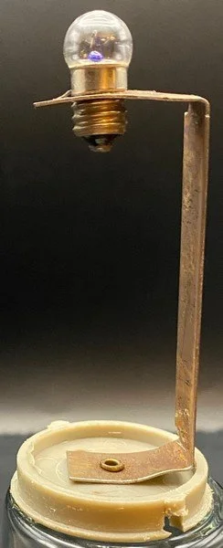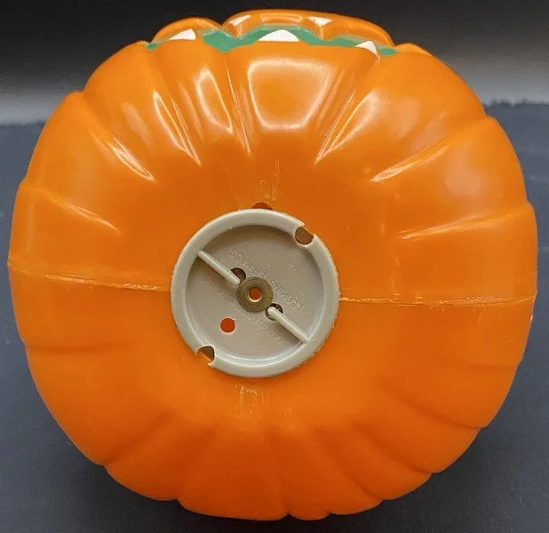 Union Products produced this hard plastic JOL during the early 1950s. It has its original thin wire bale and its bottom battery enclosure. The battery enclosure is complete with its small light bulb. The JOL itself is in significantly better than average condition with no cracks, chips or repairs. Union Products made several sizes of their battery-lit JOLs. This is the largest one - and the hardest to find. It measures ~5.75” high by ~6” in diameter.