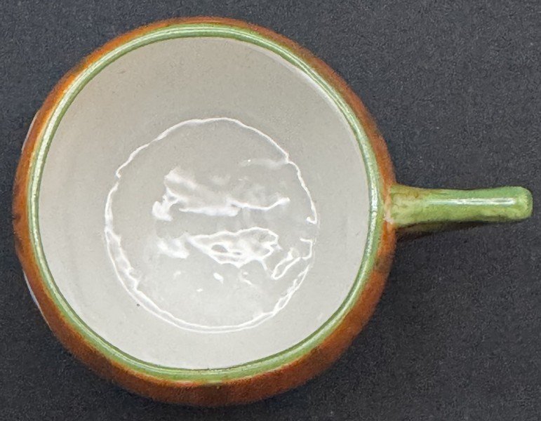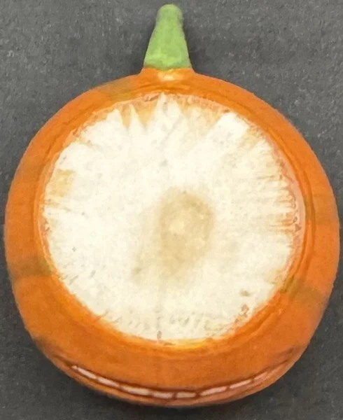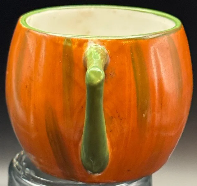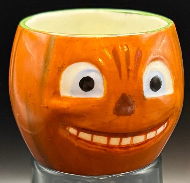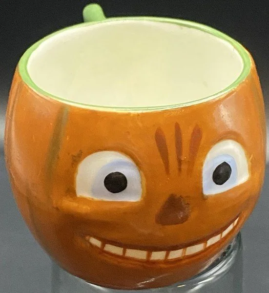 The Germans produced a nice array of Halloween porcelain tea set items. Prices for this market segment have risen sharply. This is a hard-to-find medium-sized tea cup with a handle. It measures ~2” high by ~3” across. Although this handled cup is unmarked, there is no doubt it is one made in Germany. This cup has bright, rich color and is free from chips, cracks and repairs.