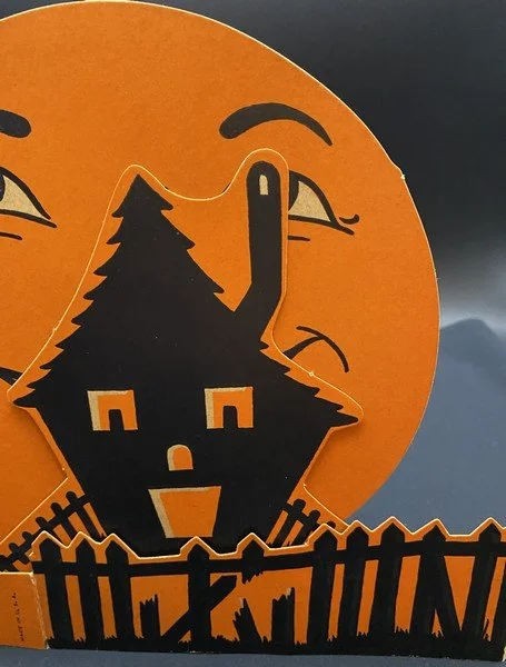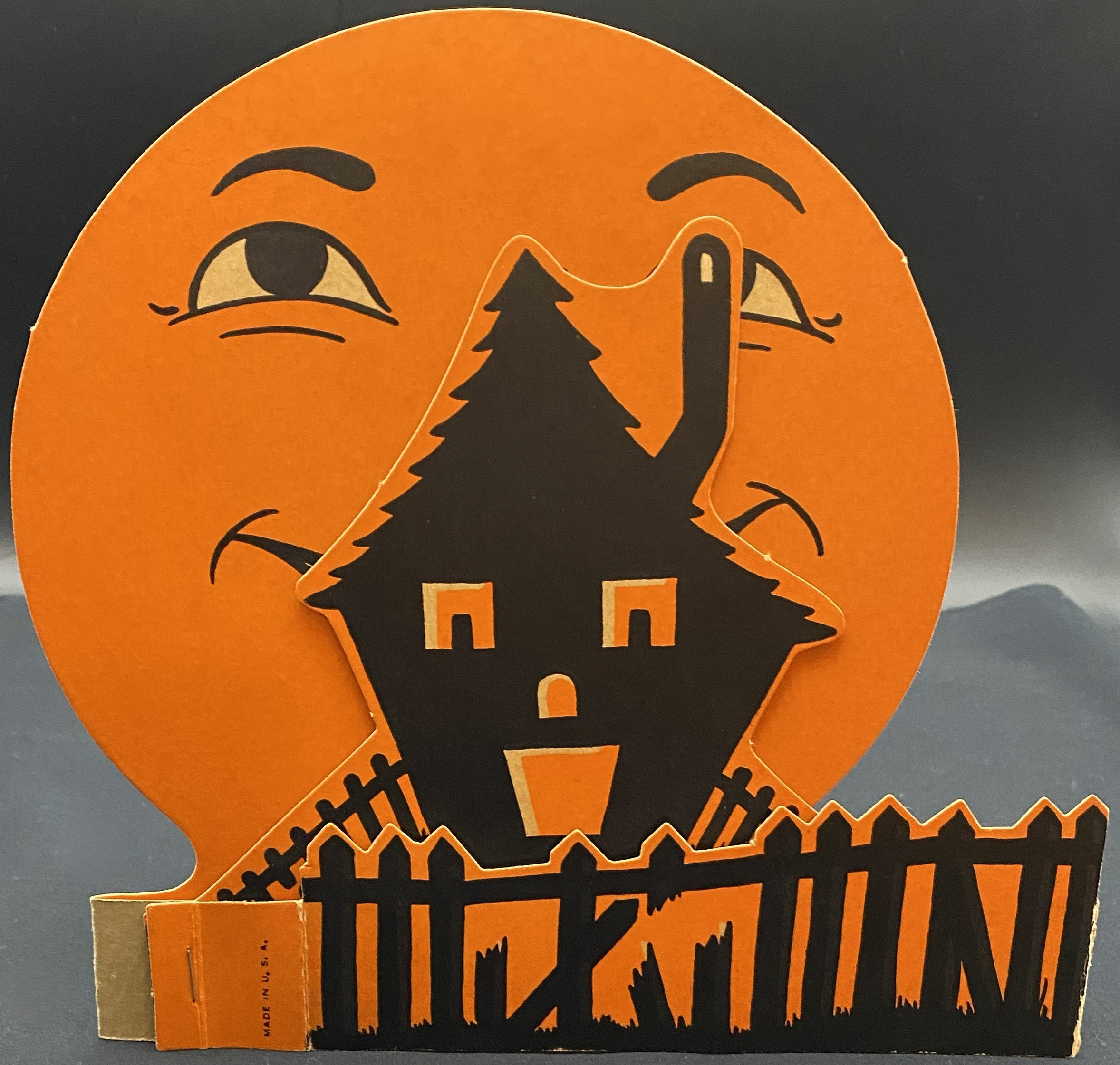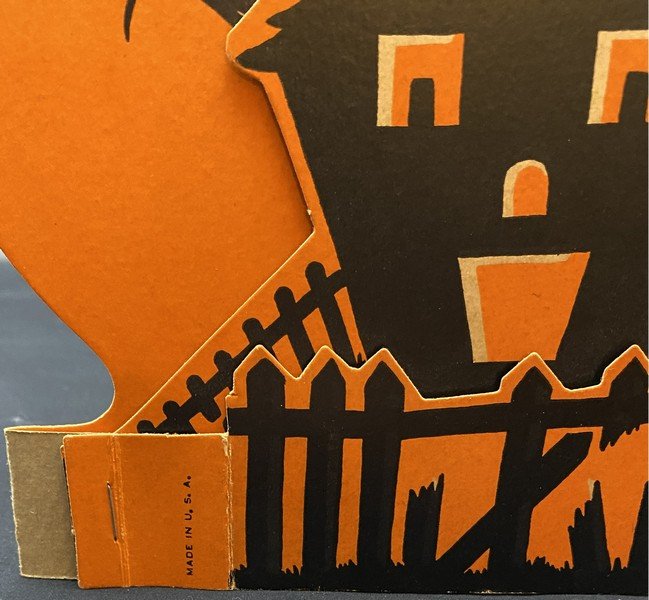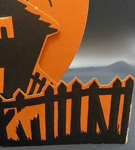 Beistle made a trio of these cleverly designed fold-out table decorations during the mid-1950s. This is the haunted house scene. This example is near-mint, looking as if it was seldom, if ever, used. It measures ~8” high by ~7.75” wide.