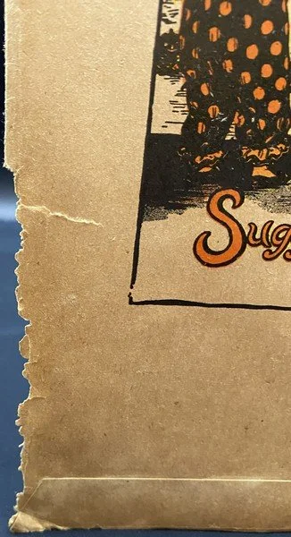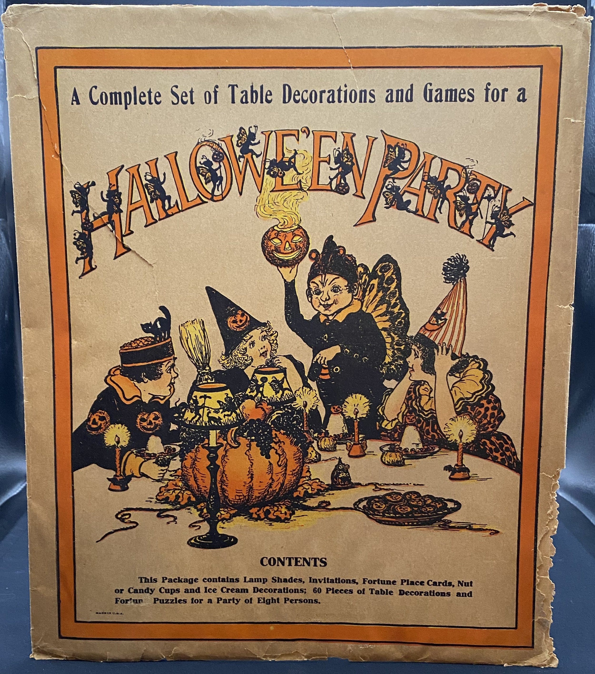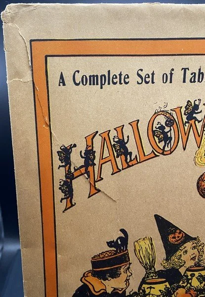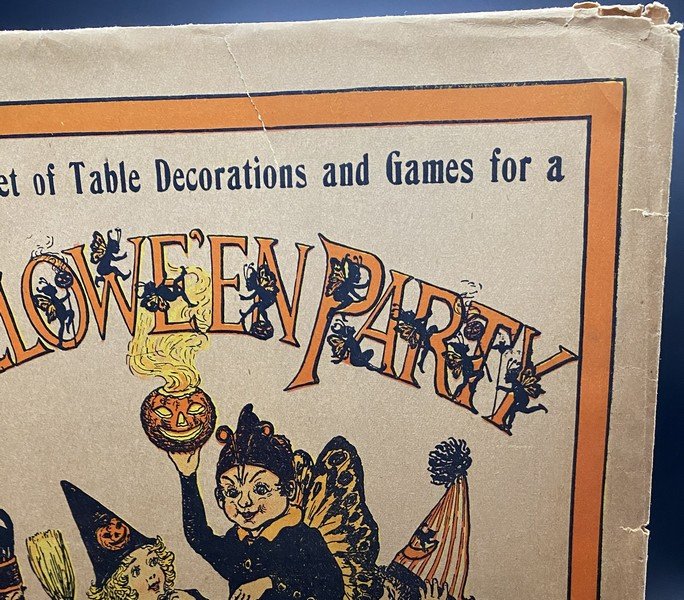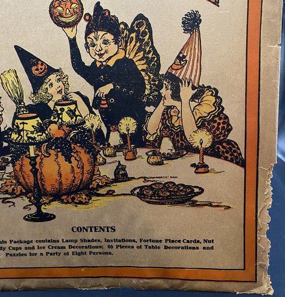 This envelope once contained what I consider to be a rare double set of material needed for a party of eight people. The envelope, from 1922, would have once held sixty pieces. A slightly more common variant of the envelope has the same imagery but different verbiage and would have held thirty pieces. This lot consists of the envelope only. It measures ~13.25” high by ~11.25” across. (It was the very next year when Beistle’s fairy motif would become ascendent and truly popular. So popular that to goose sales Beistle issued their 1923 party sets in envelopes, booklets and boxes.) There is nibbling at the lower right corner. The extant rear flap has a closed tear. Prior to its acquisition, I had not seen this variant before, hence the RSIN.