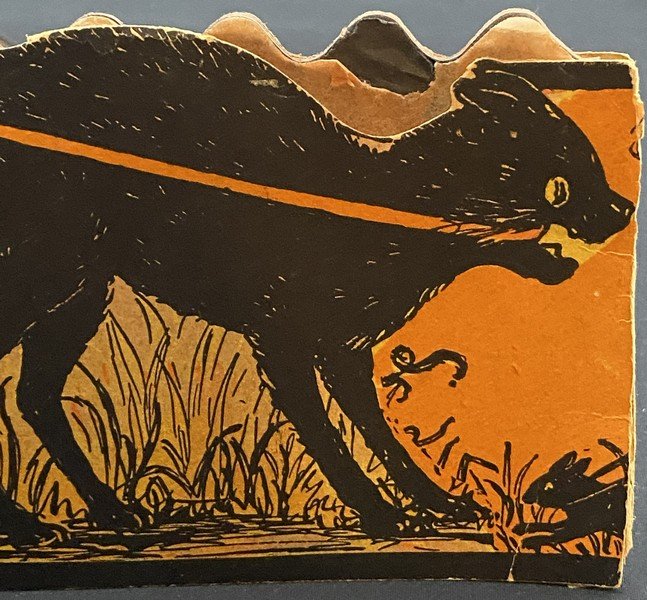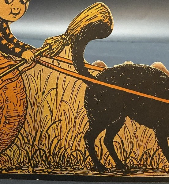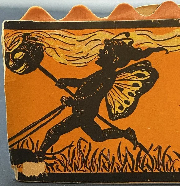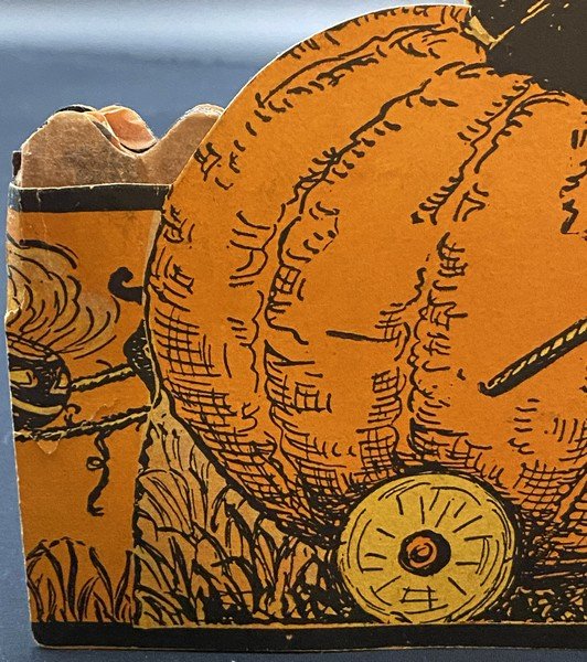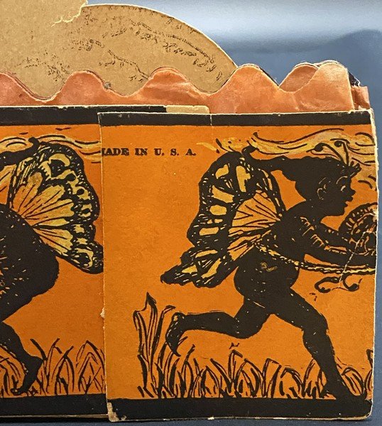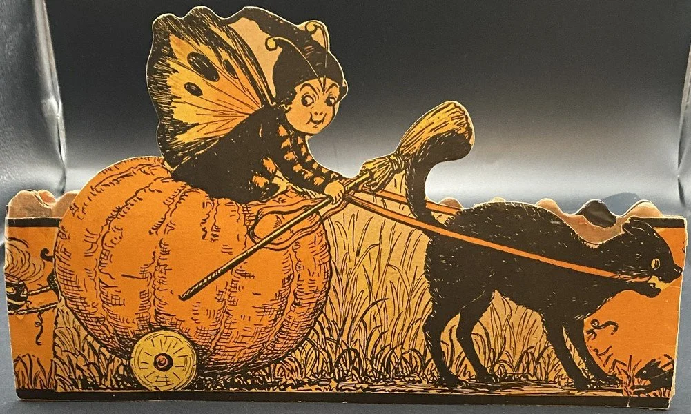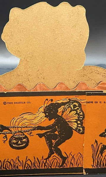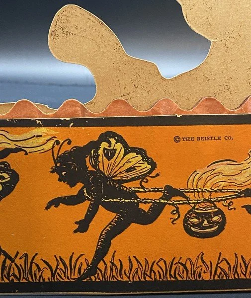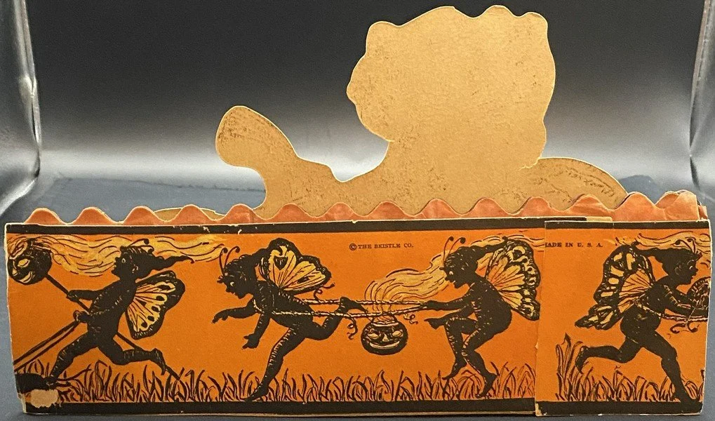 Beistle produced all four fairy honeycomb band hat designs in a single season, 1923. Each of the designs is exceedingly rare. This design shows a fairy being pulled along in her pumpkin coach by a none-too-happy black cat. The reverse shows four cavorting fairies. There is minor wear to the band hat, especially at the ends. There is a small bit of surface paper loss at the back left bottom. The colors are bright. The interior orange and black honeycomb is perfect. It measures ~6.5” high by ~11.5” across. This is the very item photographed for my reference books and appearing on page 240 of the third edition. This entered the collection on June 25, 2003. The buyer will receive a handwritten note on my personal Halloween stationery attesting to this provenance.