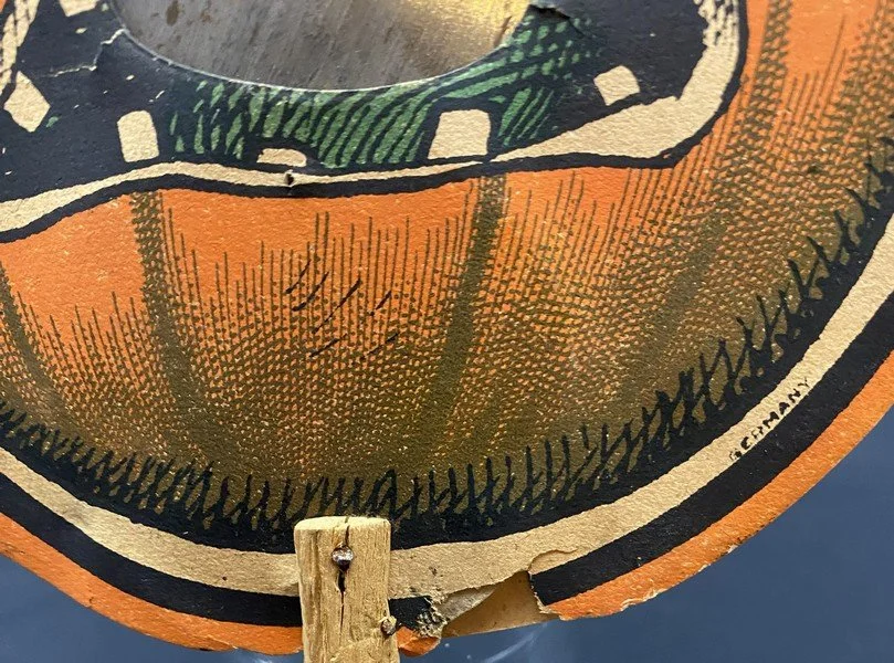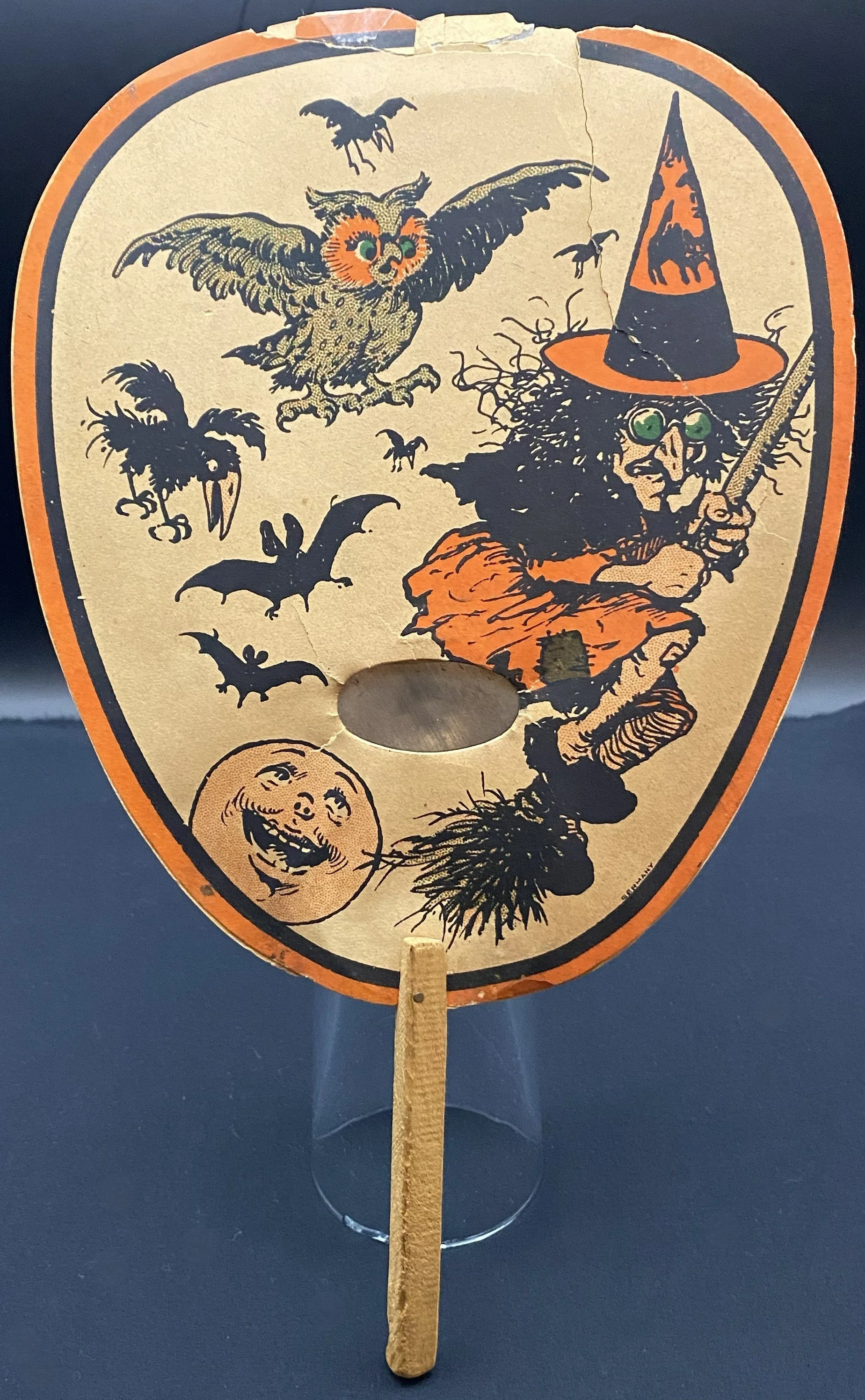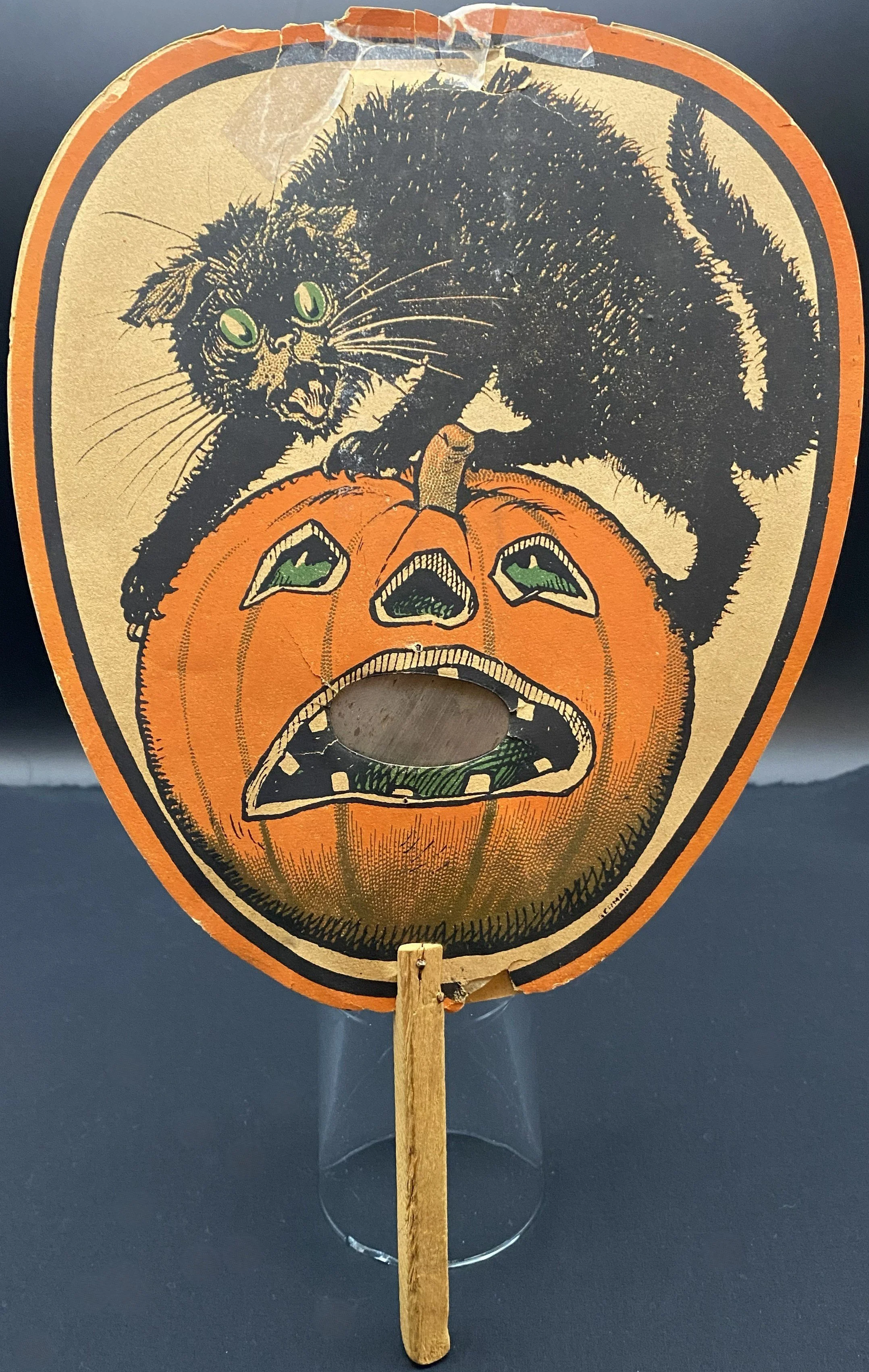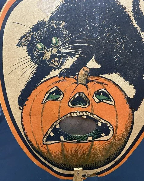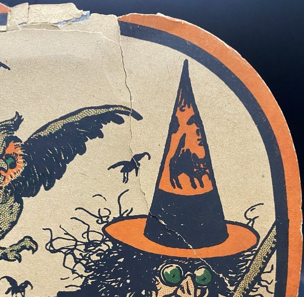 This handheld fan was produced in Germany sometime during the 1910s or early 1920s. Both sides have sublime, early imagery. On one side the ferocious cat is tormenting the JOL. The other side has that oh-so-German broomed witch riding through the sky with bats, crows and an owl. The fan was held by a simple wood stick. The fan measures ~11.5” high by ~7” across. There is significant wear at the top made worse by the liberal application of tape to hold things in place. (A good paper restorer should be able to largely repair this.) On the witch side, there is a closed tear that runs from the top border down completely through the witch.